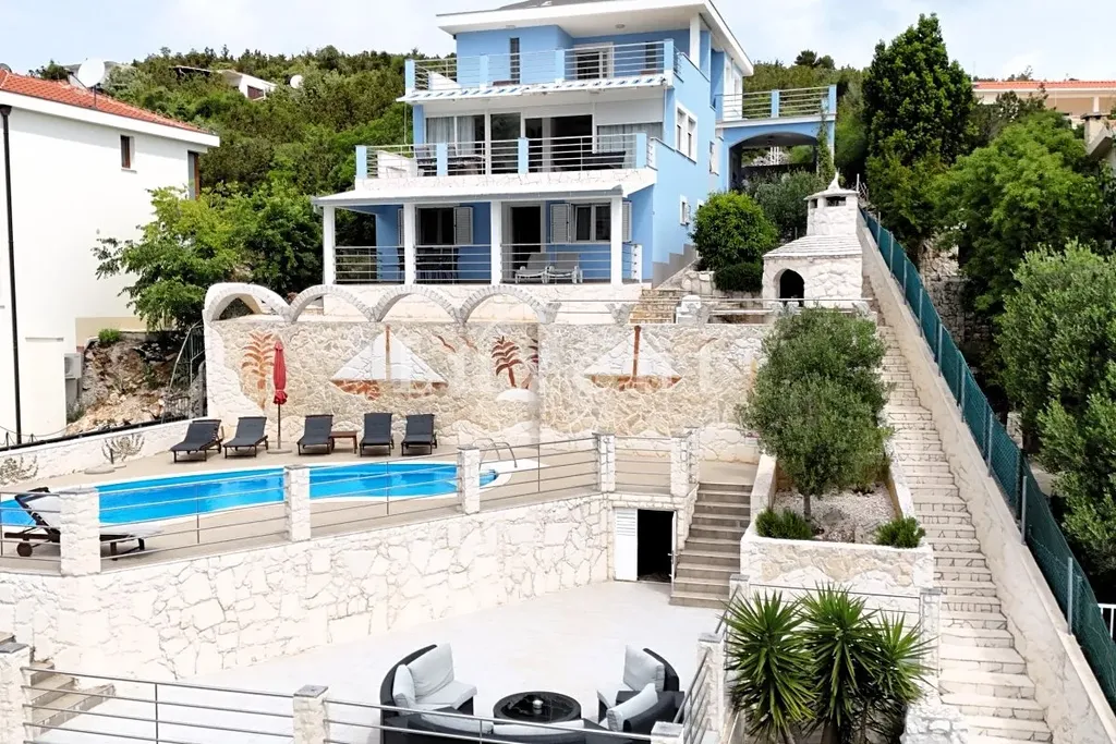 Nemovitost se rozkládá na pěti podlažích, z nichž tři slouží jako obytná, zatímco zbývající úrovně jsou využity pro technické a doplňkové zázemí. Na úrovni příjezdové komunikace, přímo u moře, se nachází mimořádně prostorná garáž – v této lokalitě skutečná rarita – s kapacitou minimálně šesti vozidel a možností dalšího parkování dle potřeby. Z garáže vede venkovní schodiště na dvě velkorysé terasy. První z nich je vybavena bazénem a sluneční plochou, ideální pro letní relaxaci, druhá nabízí klidný prostor pro odpočinek i společenská setkání s otevřeným výhledem na moře.