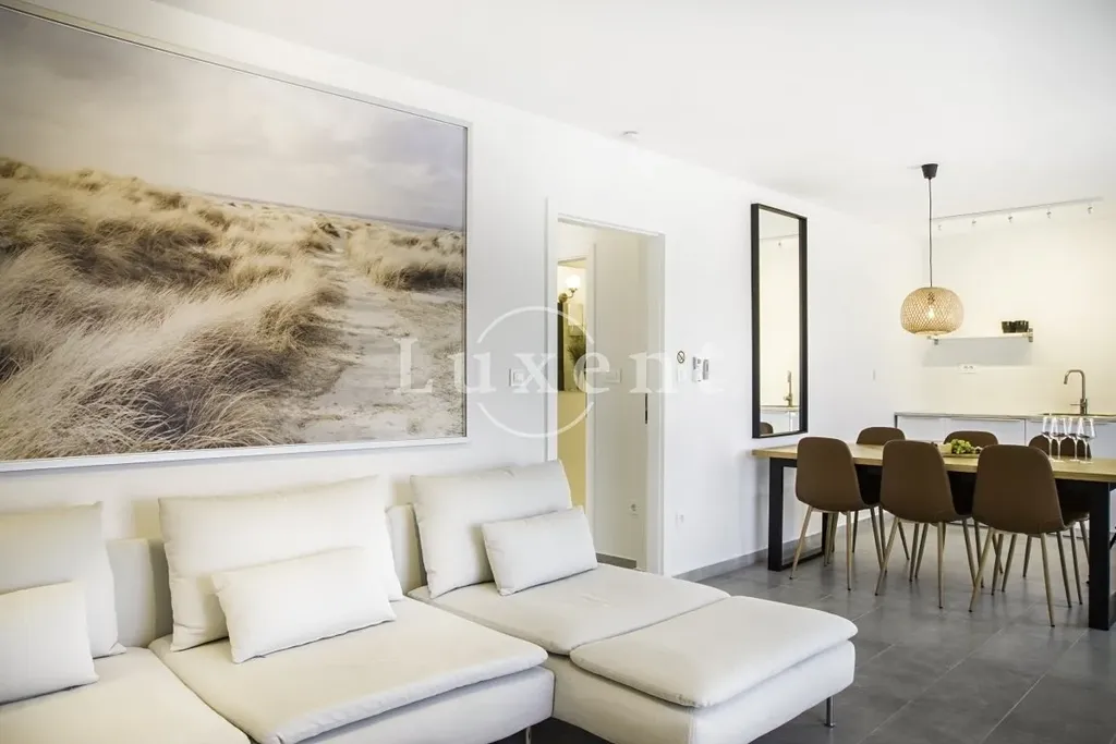 Terasa je částečně zastřešená (12 m²) a částečně otevřená (36 m²), díky čemuž je příjemné posezení venku možné prakticky celý den. Apartmán je prodáván kompletně vybavený včetně veškerého nábytku, spotřebičů a klimatizace – stačí přijet a hned bydlet nebo pronajímat.