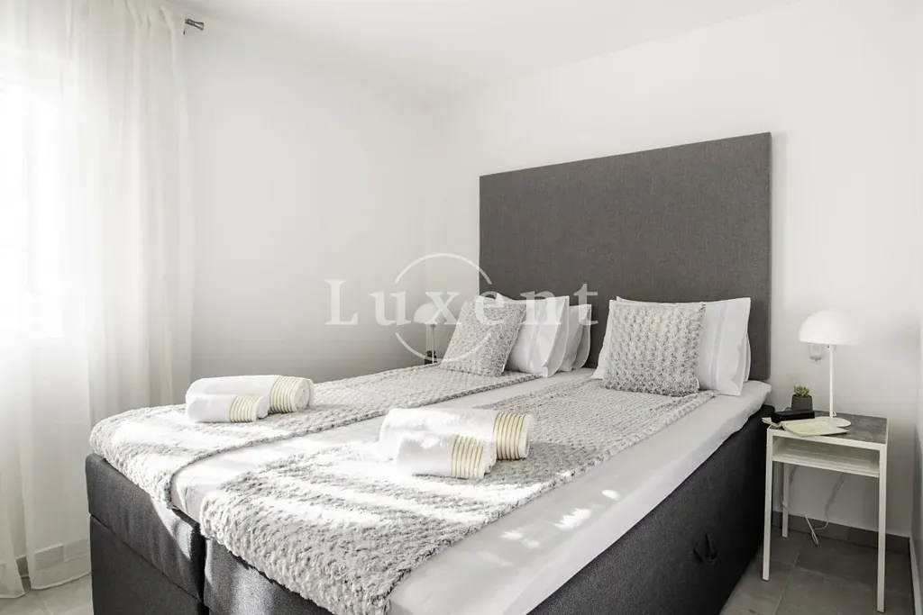 Tento plně zařízený apartmán se nachází v prostředním patře klidného třípodlažního domu a nabízí celkovou využitelnou plochu 74 m² (vnitřní prostory 57 m² + terasa). Dispozice je velmi funkční – vstupní prostor, prostorný obývací pokoj s kuchyňským a jídelním koutem, dvě ložnice a koupelna. Z obývacího pokoje i z terasy se otevírá nádherný otevřený výhled na zátoku Rogoznica.