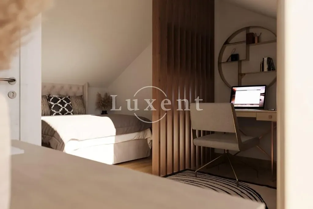 Penthouse má jihozápadní orientaci a uzavřenou obytnou plochu 78,60 m². Ve druhém patře je koupelna a otevřený obytný prostor, který zahrnuje kuchyň, jídelnu a obývací pokoj s přístupem na terasu o velikosti 11,50 m². Vnitřní schodiště spojuje druhé patro s podkrovím, kde se nachází dvě prostorné ložnice. Interiér je navržen tak, aby byl maximálně využit prostor a místnosti byly po celý den prosluněné. Terasa poskytuje příjemné místo pro odpočinek s krásným výhledem na moře.