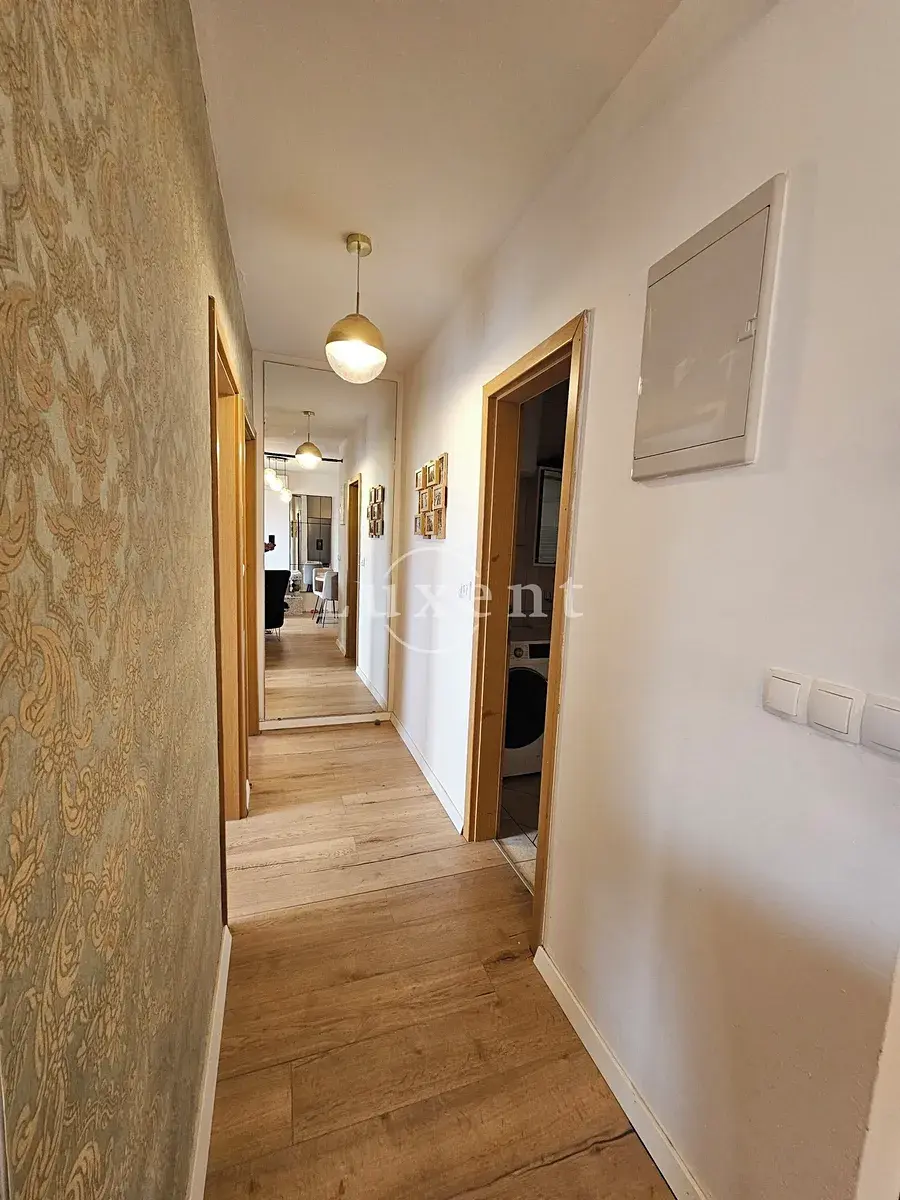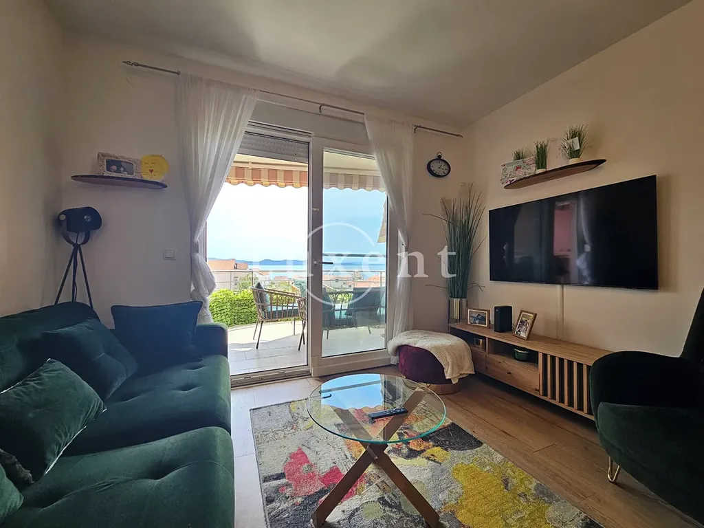 Dispozičně byt zahrnuje dvě ložnice, koupelnu, chodbu a předsíň, dále prostorný obývací pokoj propojený s kuchyní a jídelním koutem. Z obývací části je vstup na terasu, ze které se otevírá nádherný výhled na Zadarský kanál, moře a přilehlé ostrovy, což z ní činí ideální místo k odpočinku.