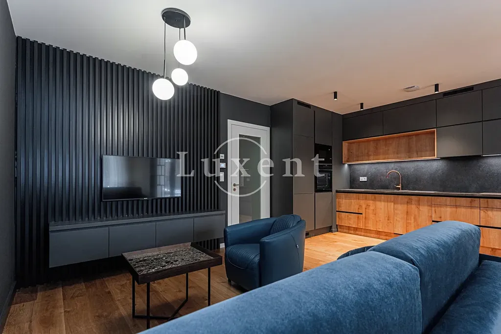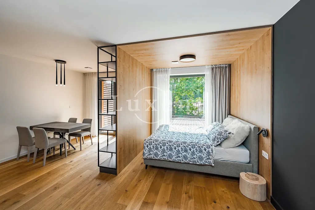 Fotografie s vybavením znázorňují možné řešení bytu v dispozici 1-2+kk, jedná se o vzorový byt 1.3.