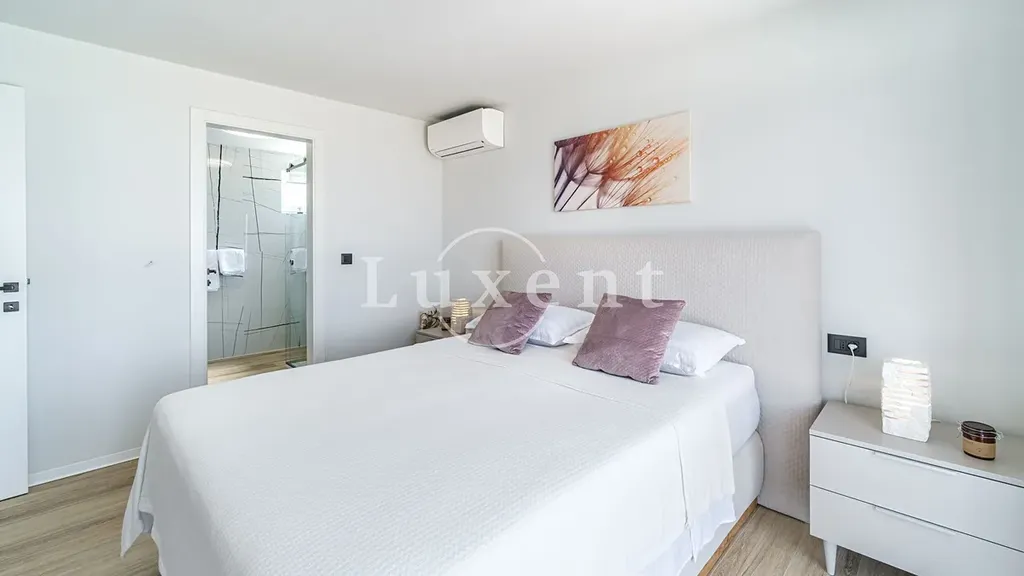 Po vnitřním schodišti se dostaneme do horního patra, kde se nachází hlavní ložnice s en-suite koupelnou a přímým vstupem na soukromou terasu. Z této terasy se otevírá nádherný výhled na moře a okolní krajinu.