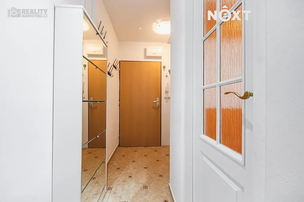 Byt je jen částečně vybavený – kuchyňská linka se spotřebiči (trouba, varná deska, digestoř, lednice, myčka), koupelnový nábytek, pohovka v obýváku a šatní skříň v ložnici, botníky na chodbě.