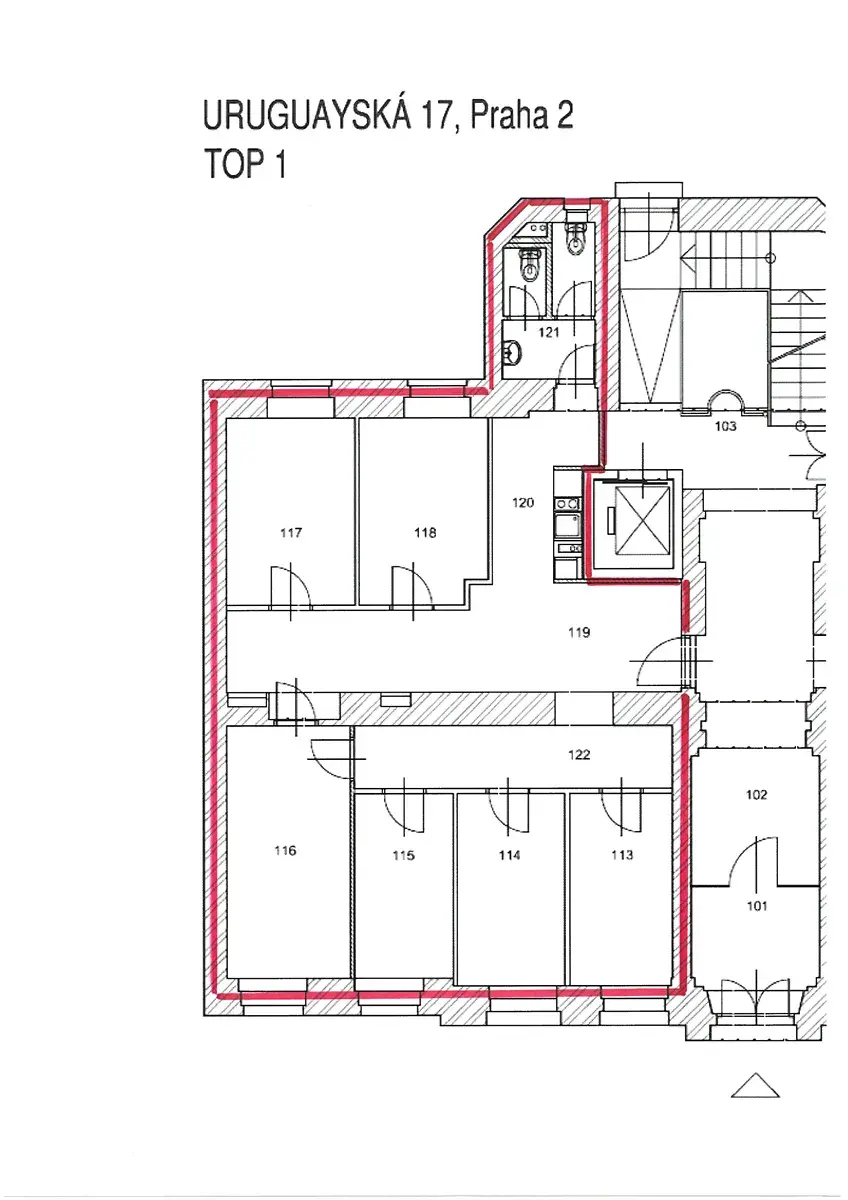 K dispozici je šest světlých, prostorných kanceláří o celkové výměře 102,82 m2. Kanceláře na nachází v 1NP objektu. Součástí prostor je vstupní hala s odděleným kuchyňským koutem, viz půdorys.