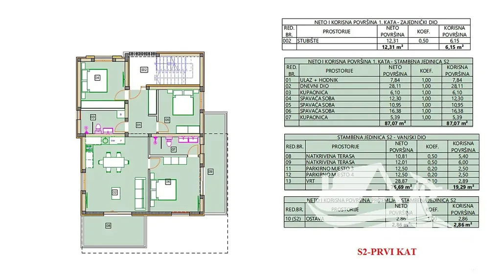 Byt S2 se nachází v prvním patře a disponuje čistou plochou 109,22 m². Dispozice je promyšlená a funkční. Vstupní chodba navazuje na otevřený obývací prostor s kuchyní a jídelnou o velikosti 28,11 m², odkud je vstup na krytou terasu 10,81 m² s příjemným výhledem na moře. Apartmán nabízí tři ložnice, z nichž hlavní ložnice o velikosti 16,38 m² má vlastní koupelnu a vstup na druhou krytou terasu 12,01 m² s krásným výhledem na moře a město. Další dvě ložnice mají plochu 12,30 m² a 10,95 m². K dispozici je také druhá koupelna.