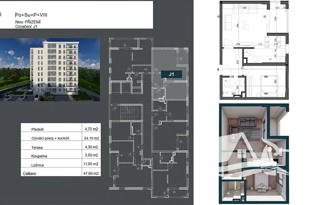 Dispozice je promyšlená do posledního detailu. Vstupní předsíň poskytuje dostatek úložného prostoru, obývací pokoj s kuchyňským koutem působí vzdušně a přirozeně propojuje interiér s exteriérem, ložnice zaručuje soukromí a koupelna je vybavena kvalitní sanitou značek Villeroy & Boch a Hansgrohe. Standard zahrnuje dubové parkety první třídy, italskou keramiku, hliníkovo-dřevěná okna a dveře i multisplit klimatizaci pro komfort po celý rok.