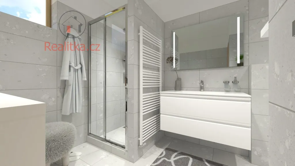 • 1. patro: Nabízí dva samostatné pokoje, praktickou šatnu a koupelnu se sprchovým koutem, dvoj-umyvadlem a tepelným žebříkem.