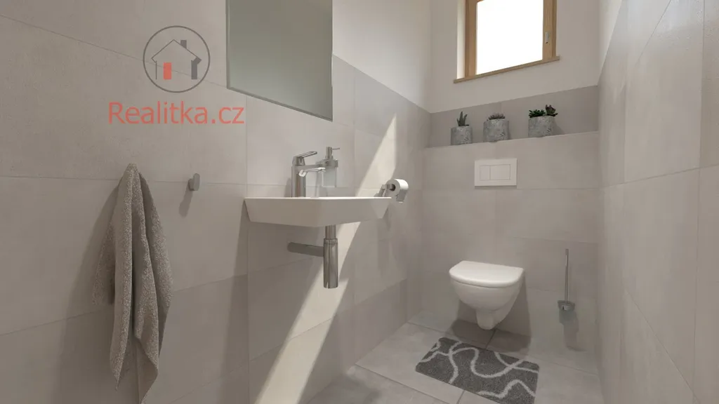 • Přízemí: Prostorná chodba, technická místnost, WC, obývací pokoj s chytře odděleným kuchyňským koutem a terasa navazující na obývací pokoj, čímž se vytváří plynulý přechod mezi interiérem a exteriérem.