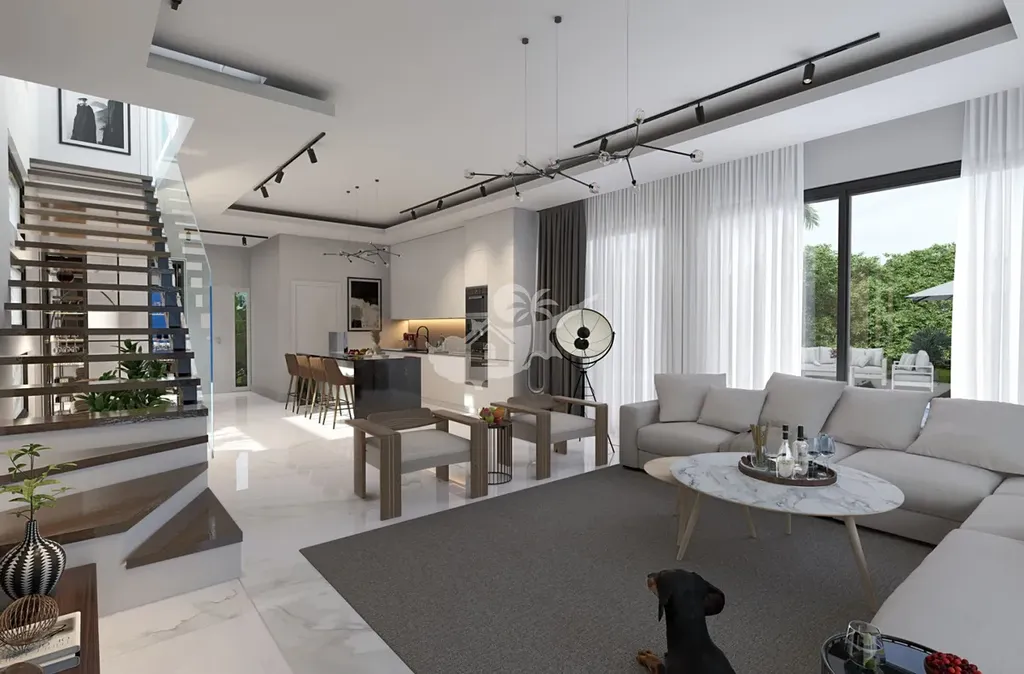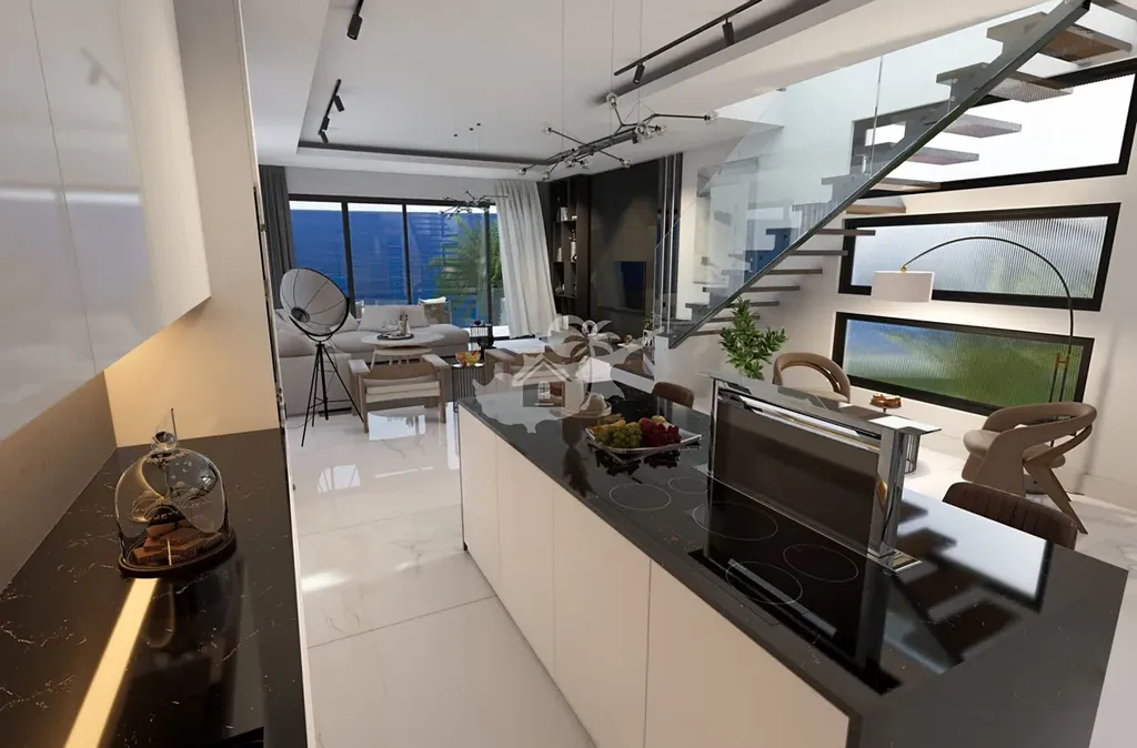 K dispozici je garáž a prostorná místnost v suterénu poskytují přirozené světlo a větrání díky orientaci k vnitřní soukromé cestě a snížené zahradě. Obytné prostory v přízemí se otevírají do krásné zahrady s bazénem, zatímco 3 ložnice s vlastní koupelnou v prvním patře nabízejí výhled na moře a hory ze všech úhlů. Každá vila má svůj vlastní bazén.