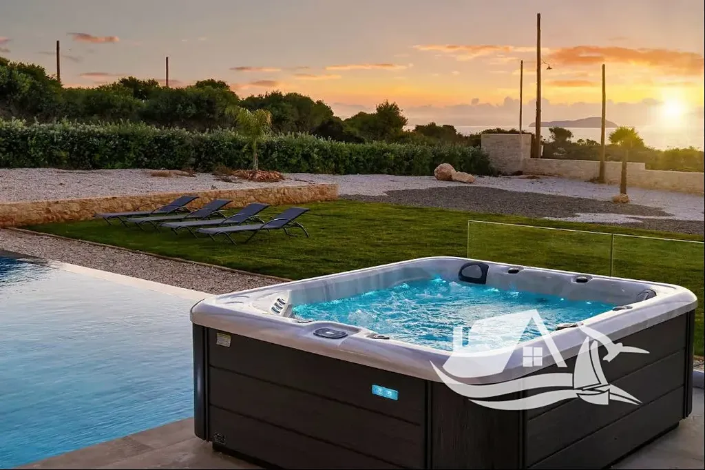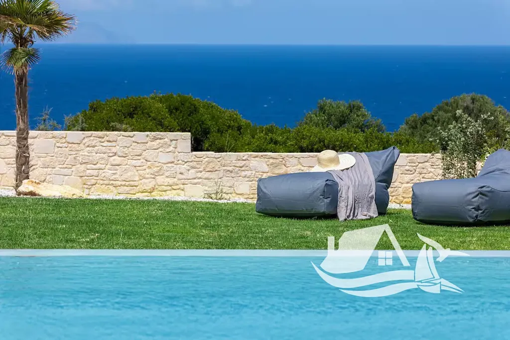 Díky vyvýšené poloze nabízí vila úchvatné panoramatické výhledy na Krétské moře i okolní hory. Dominantou exteriéru je prostorná terasa s privátním infinity bazénem, který opticky splývá s horizontem. Venkovní část je navržena pro pohodlný středomořský životní styl a zahrnuje kryté venkovní posezení, plně vybavenou letní kuchyni s BBQ, dřezem a pracovní plochou, venkovní sprchu a relaxační zónu se slunečníky a lehátky.