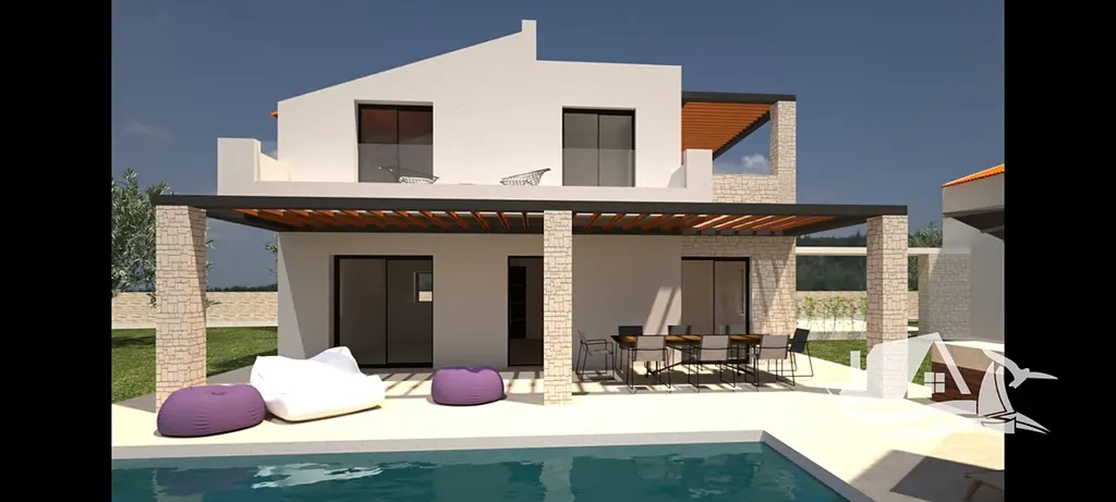 Exteriér poskytuje ideální prostor pro relaxaci – soukromý bazén, sluneční zónu a prostornou zahradu obklopenou olivovníky, doplněnou kamennými zídkami. Dva velké balkony nabízejí nádherné výhledy na moře i okolní krajinu, ideální pro vychutnání východů a západů slunce.