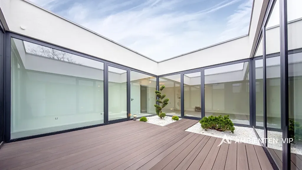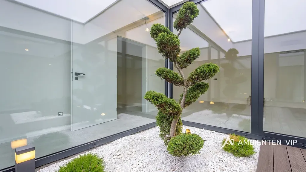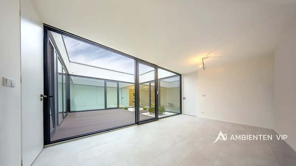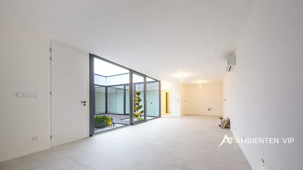 Nemovitost disponuje velkým obývacím pokojem s kuchyňským koutem o velikosti 45 m2. Kompletně vybavená kuchyňská linka bude vybudována panem majitelem před nástup do pronájmu. Z obývacího pokoje i z dalších dvou pokojů je přímý vstup do vnitřního proskleného atria s otevřenou oblohou (28m2) a je unikátní místem pro odpočinek, inspiraci či welness.