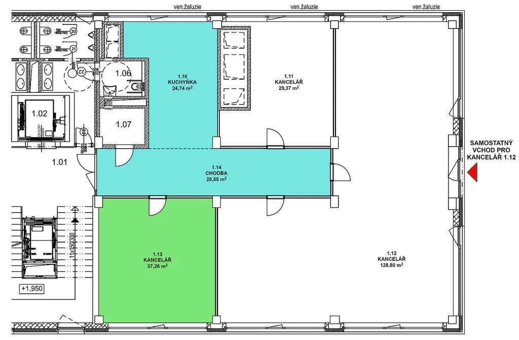 Místnost č. 1.11 s výměrou 22,52 m² s výhledem do ul. U věže.
