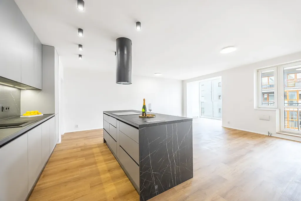 Byt je dispozičně velmi dobře řešený s kuchyní na míru s ostrůvkem spojenou s obývacím pokojem, dále se třemi prostornými ložnicemi, dvěma nádhernými koupelnami ve vysokém standardu a se dvěma toaletami.