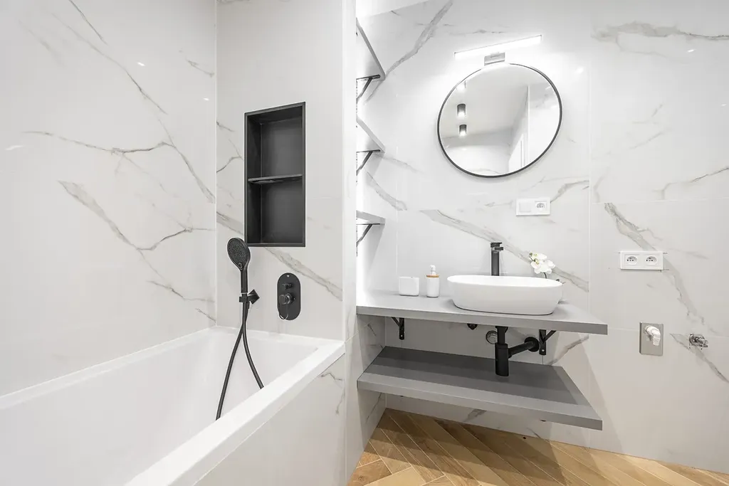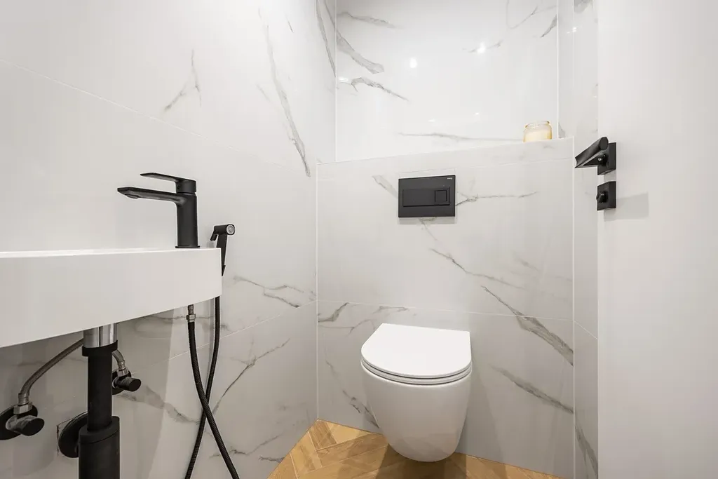 Jedna koupelna s přístupem z hlavní chodby je vybavena vanou s nikou a designovým umyvadlem na skříňce a přípravou na pračku. O teplo se postará topný žebřík a podlahové vytápění. V bytě je samostatná toaleta s vlastním umyvadlem.