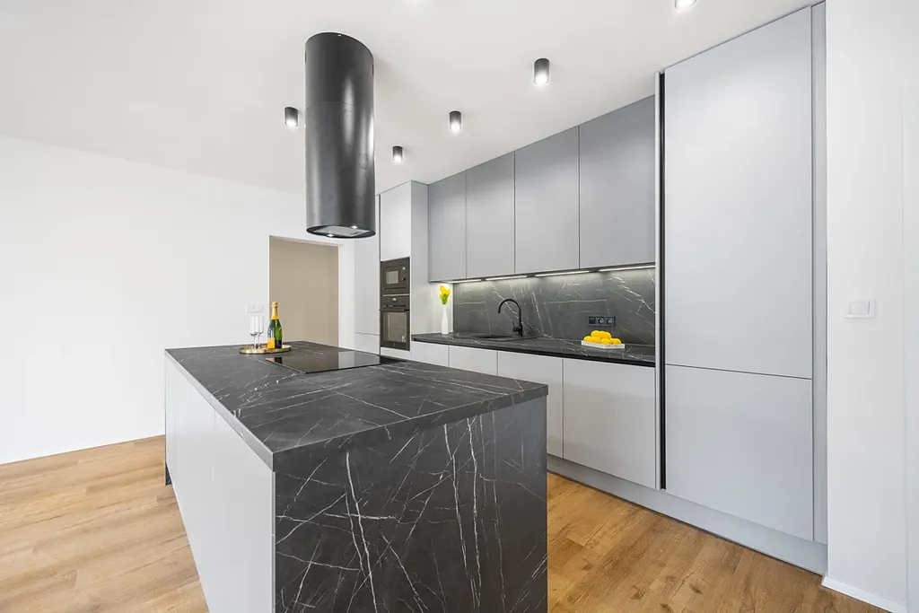 - nová kuchyňská linka s ostrůvkem vyrobena na míru se spotřebiči (značková elektrická trouba, myčka, indukční deska, digestoř, osvětlení, dřez)