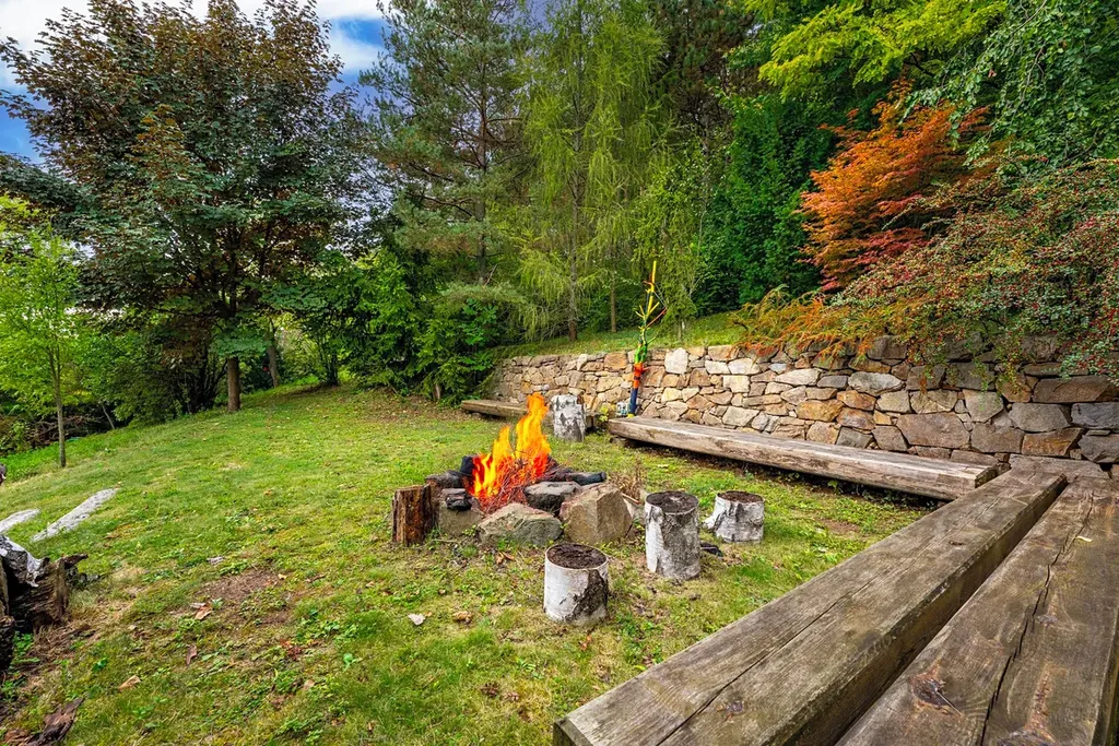 Zahrada nabízí příjemné propojení teras s obytným prostorem, najdete zde místa ideální pro posezení, grilování i klidný odpočinek. K dokonalému uvolnění přispívá také možnost relaxovat uvnitř v sauně, zatímco venku na střeše čeká vyhřívaný bazén s působivým výhledem do okolí. Celý venkovní prostor zkrášlují okrasné dřeviny a ovocné stromy, které dodávají zahradě charakter i nezaměnitelnou atmosféru. Na hranici lesa pak stojí samostatná rekreační chata, jež vytváří další unikátní zákoutí v srdci přírody.