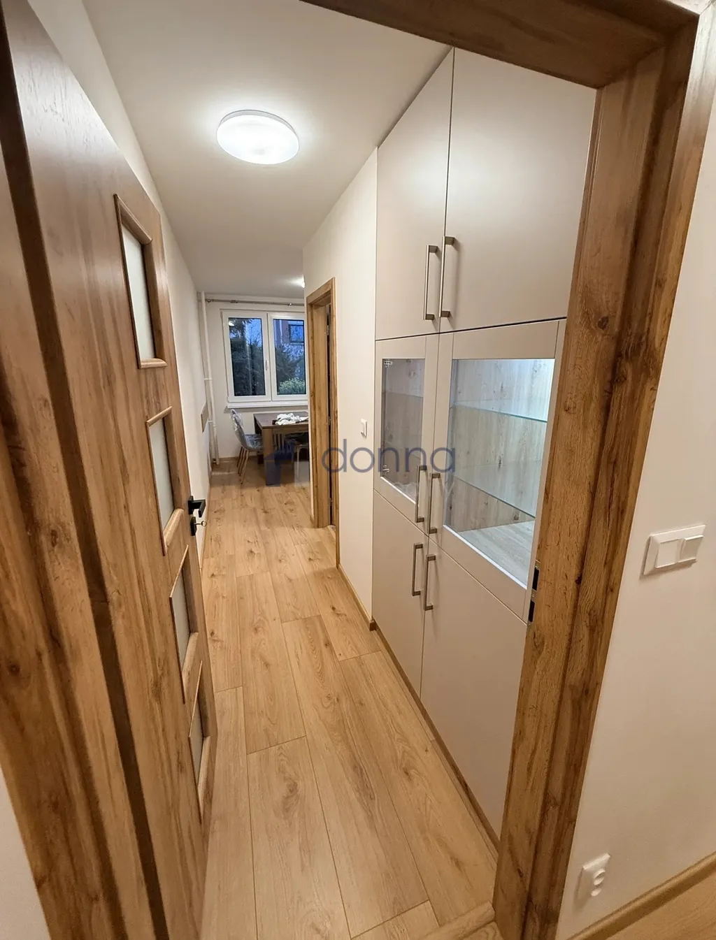 2 ložnice plně vybavené nábytkem (lůžko 180x200 s matrací, šatní skříň, komoda, psací stůl). Dále chodba s velkou skříní, plně vybavená kuchyň s jídelním prostorem, kde se nachází jídelní stůl a židle, koupelna se sprchovým koutem, umyvadlem se skřínkou a zrcadlem, pračka, topný žebřík, samostatné WC s umyvadlem s zrcadlem, komora nebo šatna.