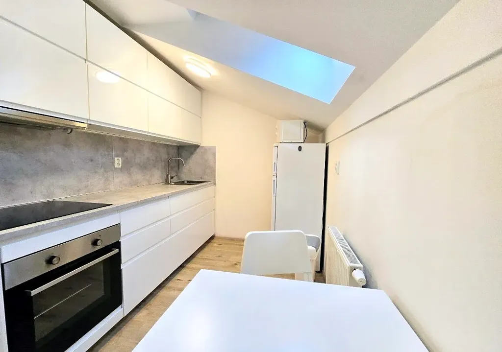 Interiér bytu je navržen s důrazem na světlo, vzdušnost a funkčnost. Dominantou je moderní kuchyňská linka s vestavěnými spotřebiči (sklokeramická varná deska, horkovzdušná trouba, lednice s mrazákem), která splňuje požadavky i náročnějšího klienta.