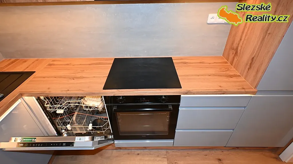 nová kuchyňská linka s vestavěnými spotřebiči (myčka, lednice, indukční varná deska, multifunkční elektrická trouba)