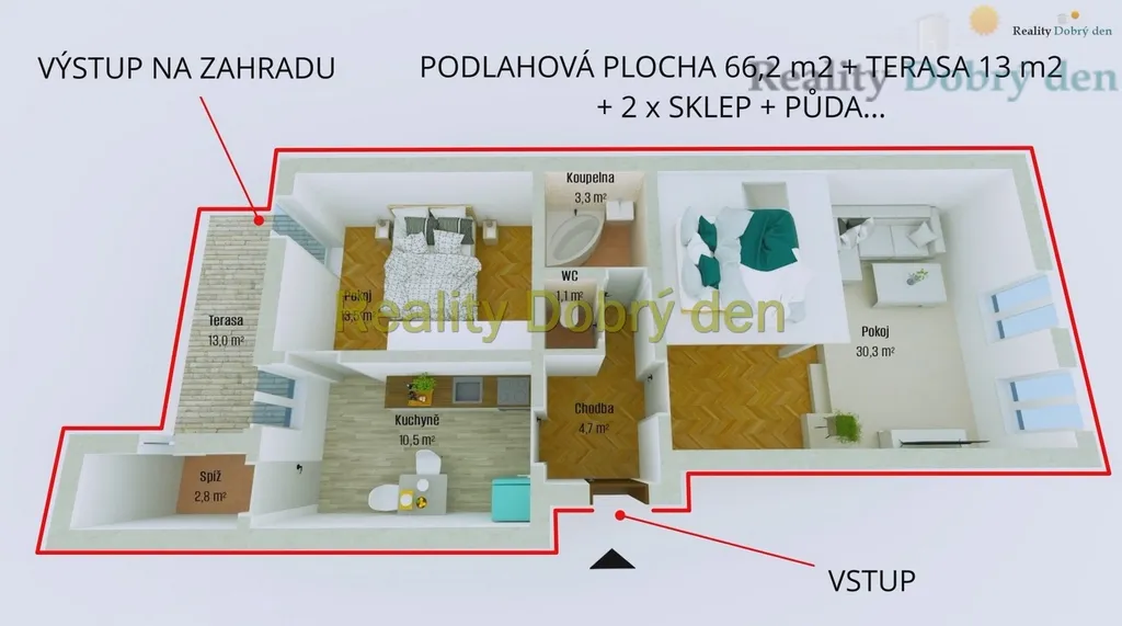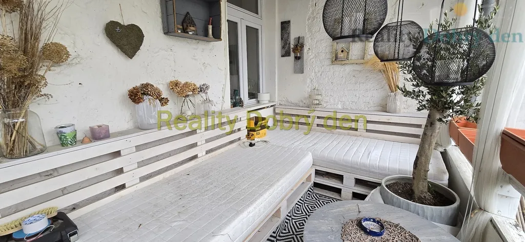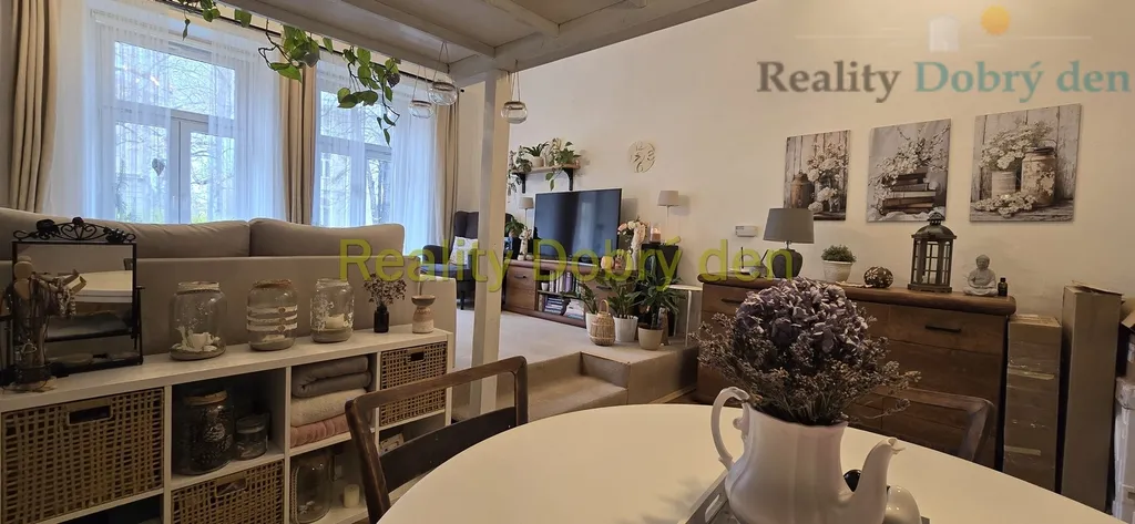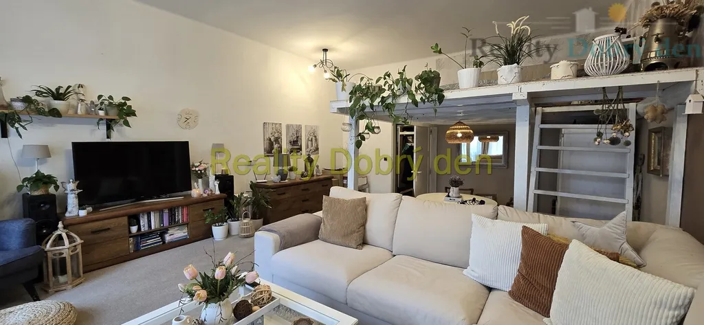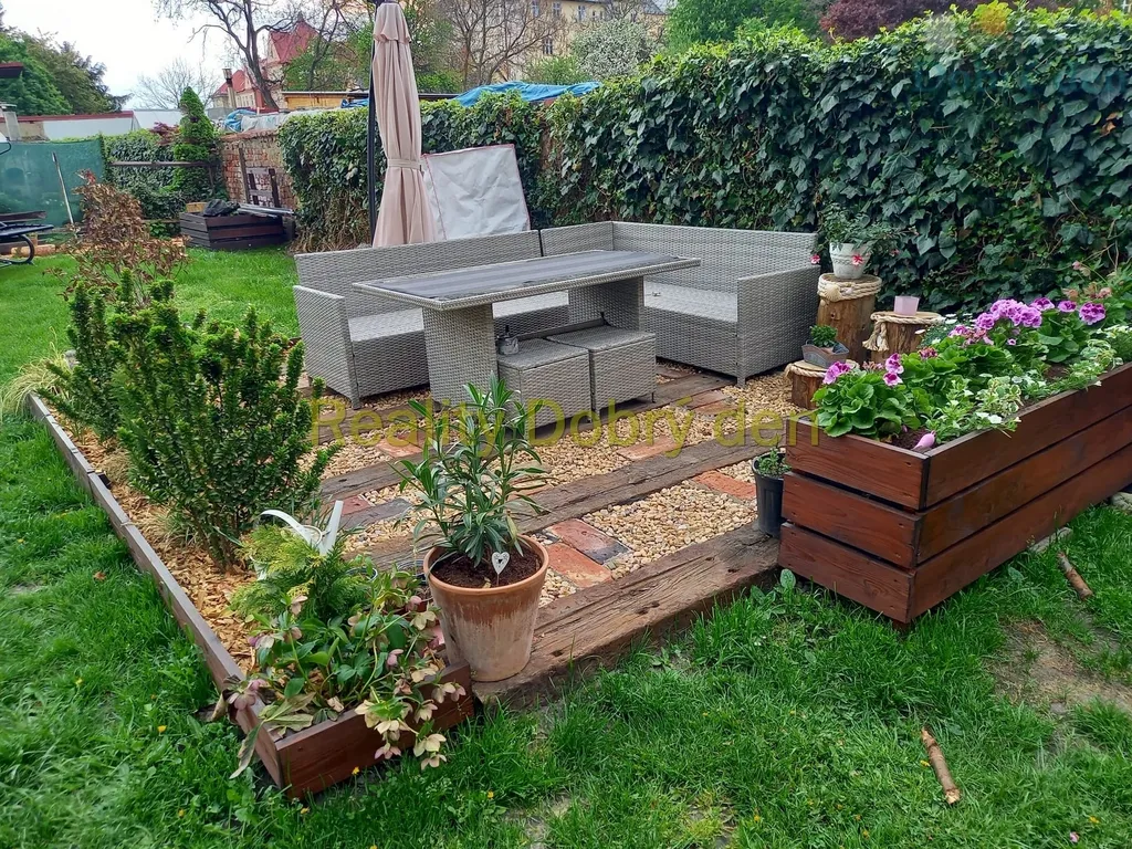 Byt má neprůchozí pokoje, obývací pokoj s pódiem a vestavbou, koupelna s umývadlem a vanou, zvlášť WC, kuchyně s technickou místností, z pokoje východ do kryté terasy se vstupem do oplocené zahrádky. K bytu náleží podíl na pozemku za domem, přičemž tento podíl představuje opocenou zahrádku o výměře 151 m2. Zahrada je využita jako relaxační zóna s venkovním posezením, fotografie rozkvetlé zahrady jsou z loňského léta.