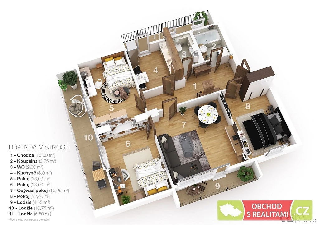 Dispoziční plánek bytu přikládáme, aktuální dispozice bytu je 4+1 s navzájem neprůchozími místnostmi, výměra bytu je 86,3 m² + součet výměr lodžií 21,5 m² + zděná sklepní kóje v suterénu domu o výměře 2,7 m². Nad celou délkou bytu je půdní prostor, který je určený k výlučnému užívání právě pro tento byt (foto půdního prostoru též přikládáme)!