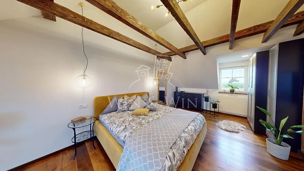 Patro: Koupelna, ložnice a hlavní ložnice s přiznanými trámy o celkové výměře 27 m2, pochozí půda sloužící jako další úložný prostor