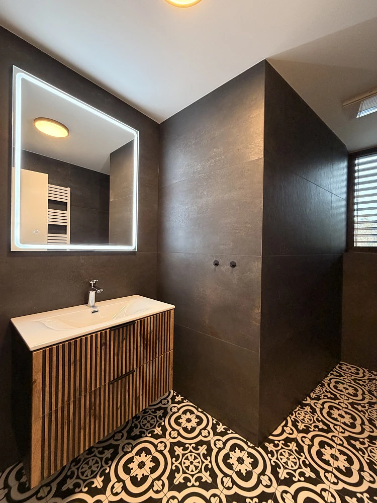 Koupelna i toaleta působí velmi elegantně, což podtrhuje celkový nadstandard bytu.