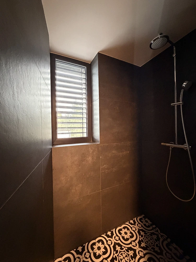 Interiér je laděn do moderního stylu – vinylové podlahy, vestavěný nábytek a exteriérové elektrické žaluzie zajišťují maximální komfort bydlení.