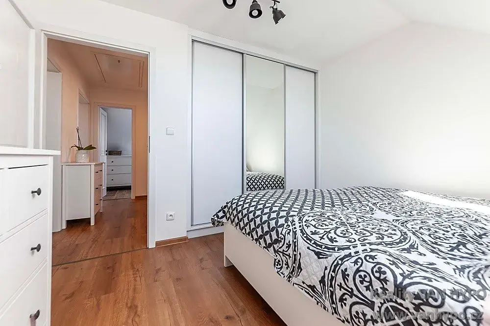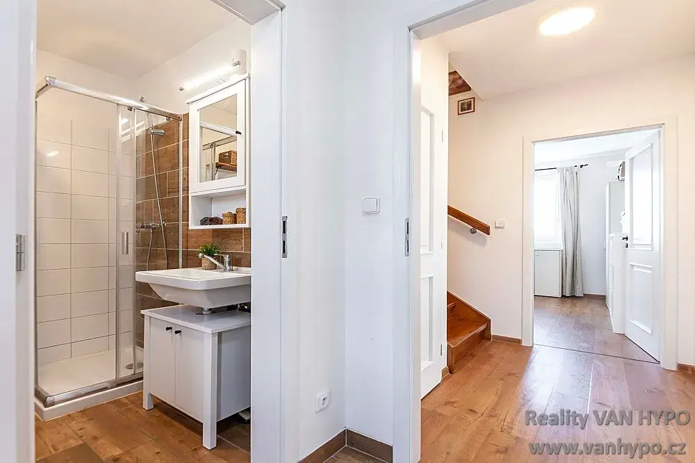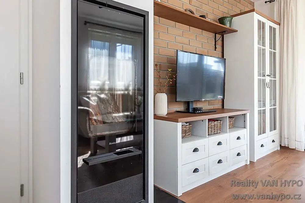 Citlivě zařízený světlý interiér s praktickou dispozicí nabízí v prvním nadzemním podlaží vstupní chodbu a halu, koupelnu se sprchovým koutem, toaletou a místem pro pračku/sušičku, sklad pod schody, pokoj/pracovnu a především otevřený obytný prostor s krbem, který je propojený s kompletně vybavenou kuchyní a jídelním koutem. Z obytného prostoru je přes francouzské okno vstup na zastřešenou terasu a dál do udržované zahrady. Ve druhém nadzemní podlaží, kam vedou stylové dřevěné schody jsou k dispozici 3 ložnice, koupelna s vanou a toaletou a dále skladový prostor na půdě. Praktická je i garáž s průchodem do zahrady, která může samozřejmě sloužit i jako sklad a dílna.