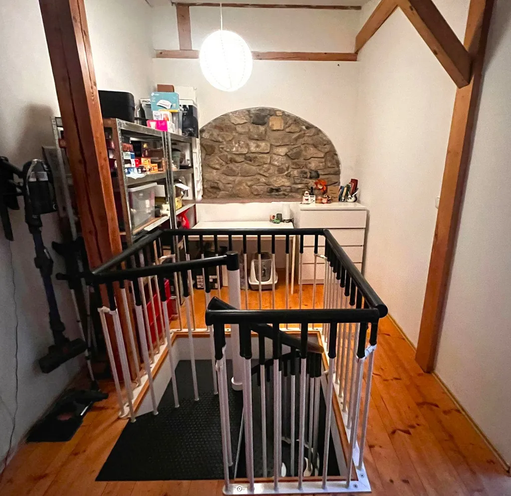V přízemí je zádveří, koupelna a obývací pokoj s koupelnou se sprchovým koutem a pračkou (39 m²), v patře je pak chodba a ložnice (40 m²). Z obývacího prostoru je vstup na terasu (42 m²). Byt je vytápěn plynovým kotlem.