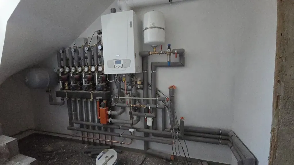 Vytápění a ohřev vody zajišťuje společný plynový kondenzační kotel Baxi a podlahové vytápění po celém bytě.