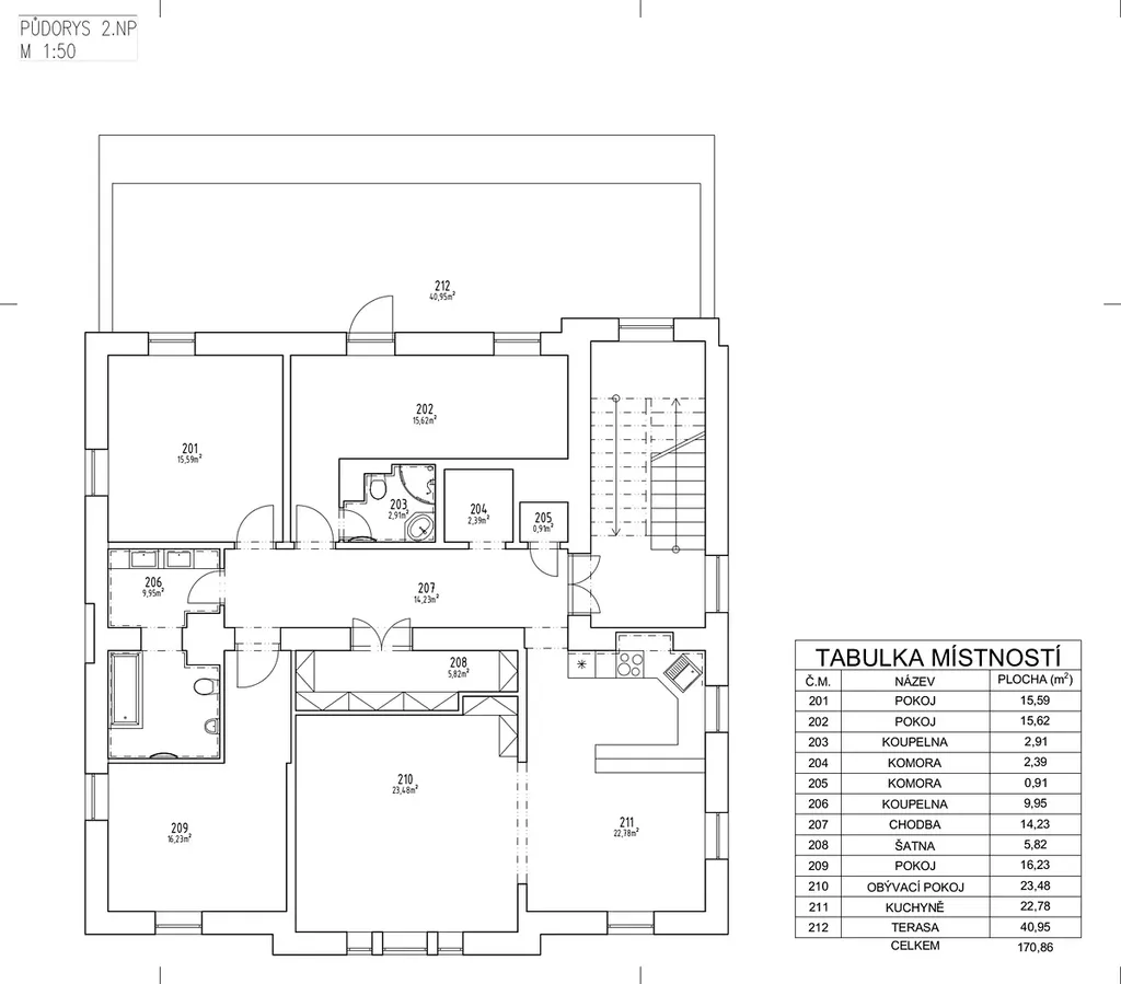 Do prvního patra se dostaneme po schodech (dům je bez výtahu). Byt je velice slunný (okna jsou orientována na jih, západ a sever, terasa je na východní straně domu. Všechny pokoje spojuje chodba. Pokoje tedy nejsou průchozí. Byt se skládá ze 4 pokojů, kuchyně s jídelnou, dvou koupelen (obě s WC), prostorné šatny, dvou komor a chodby.