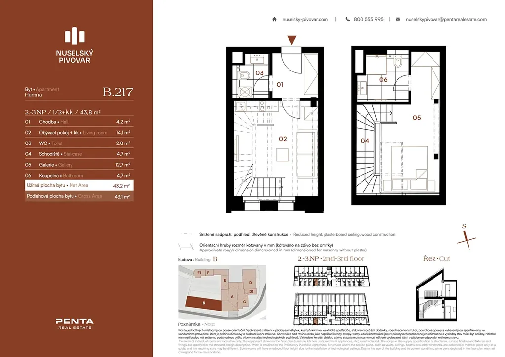 Nový byt č. B.217 o dispozici 1/2+kk (43,2 m2) se nachází ve 2.-3. nadzemním podlaží budovy B v projektu Nuselský pivovar Lofty.