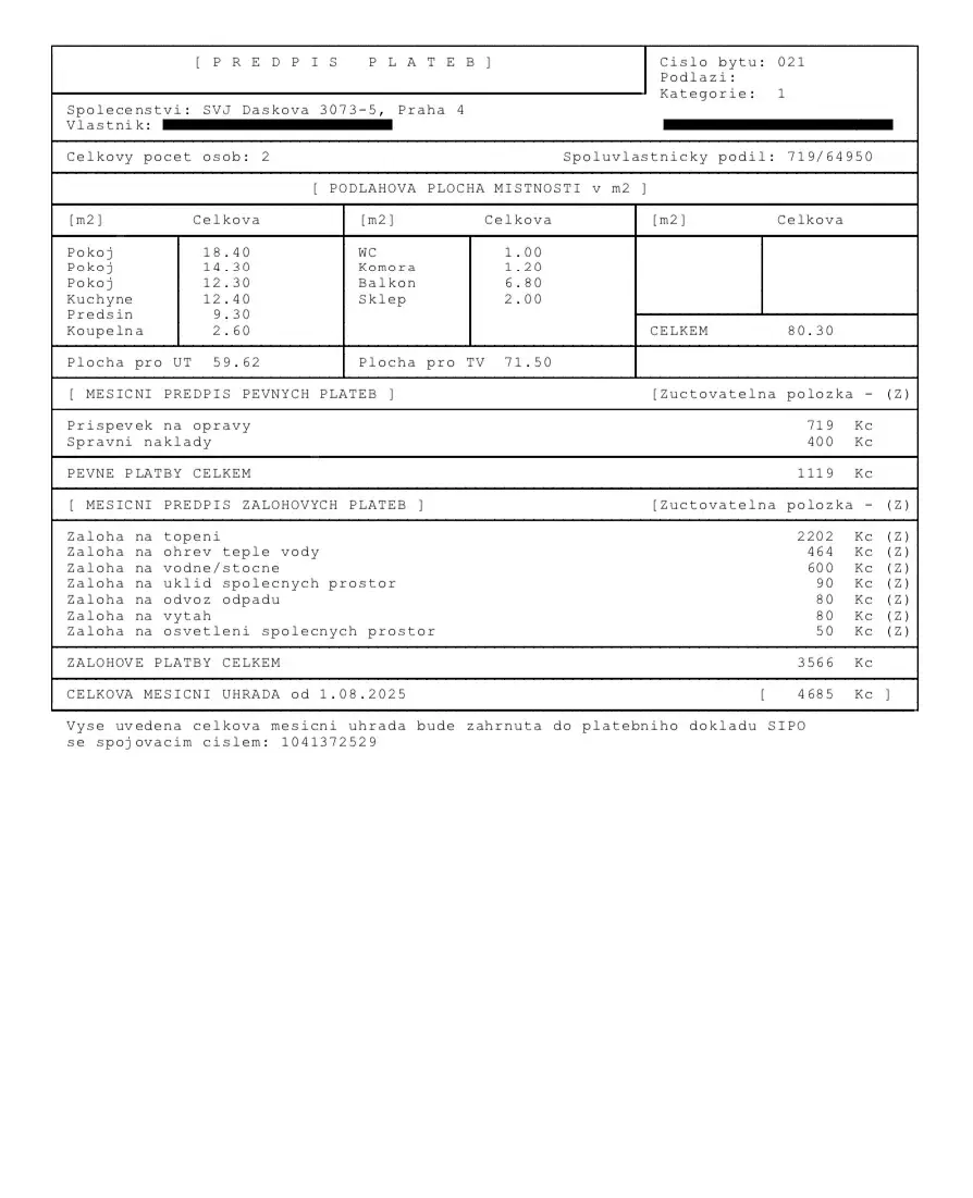 • Topení + ohřev vody + vodné stočné + úklid společných prostor + odvoz odpadu + výtah + osvětlení společných prostor + příspěvek na opravy + správní náklady = 4.685,- Kč.