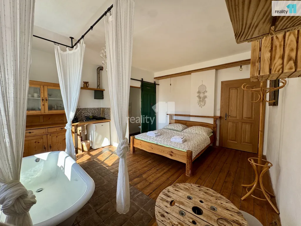 Na patře se nachází také byt 1+1, který lze využít jako další ubytovací jednotku, dlouhodobý pronájem nebo vlastní zázemí.