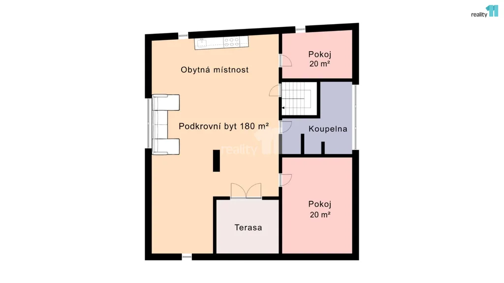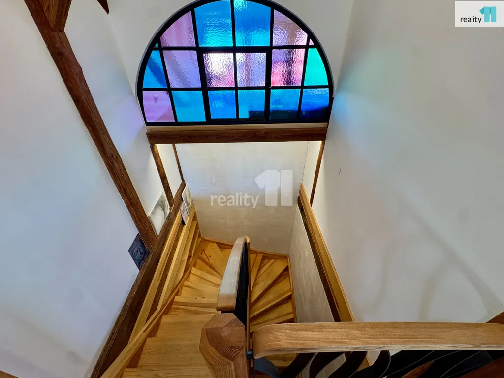 V horním patře je podkrovní byt 3+kk o ploše 180 m² s terasou a výhledem na tvrz. Vhodný pro vlastní bydlení, dlouhodobý pronájem i rozšíření ubytování.