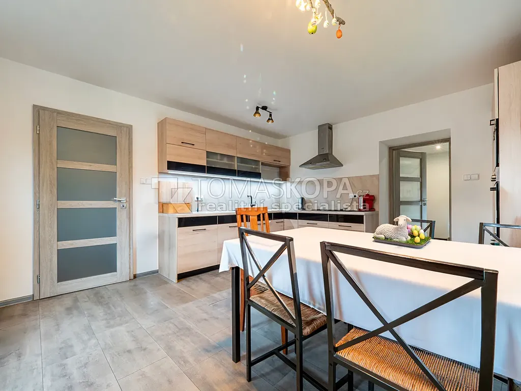Dům o dispozici 5+2 a podlahové ploše 157 m² prošel citlivou rekonstrukcí interiéru. Nabízí nové rozvody, podlahy i dveře a představuje ideální řešení pro rodinu, která hledá dostatek prostoru a soukromí v přírodě, ale nechce platit vysoké náklady typické pro bydlení v Praze.