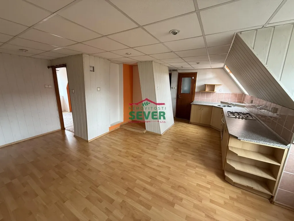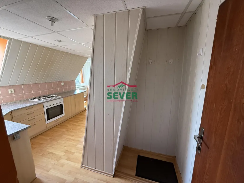 Nemovitosti SEVER vám zprostředkují prodej bytu 2+kk v osobním podílovém spoluvlastnictví, Horní Litvínov, okr. Most, Komenského. Bytová jednotka po částečné rekonstrukci, o výměře 48 m2, se nachází ve třetím nadzemním podlaží cihlového domu a jeho součástí je velký sklep, půda a pozemek za domem, který se používá jako zahrada k relaxaci. Půdní prostor lze dokoupit k vytvoření další místnosti. V podkrovním bytě je kuchyně propojena s obývacím pokojem. Je zde nová rohová kuchyňská linka obložena dlaždičkami, kombinovaný sporák, na zemi plovoucí podlaha. V ložnici je krytina PVC a zadní místnost jde používat jako šatna. Jsou zde nová okna Velux, dřevěné dveře se zárubněmi, rozvody vody v plastu a topení v mědi. Koupelna a WC jsou společné ve zděném jádru, v částečném keramickém obkladu. Je zde sprchový kout, přípojka na pračku, odvětrávací okno a plynová karma na ohřev vody. Vytápění bytu je řešeno plynovými gamaty. Byt je možné zakoupit i s nájemníkem na investici. Dům se nachází v klidné části města bez problémových nájemníků v blízkosti centra města.