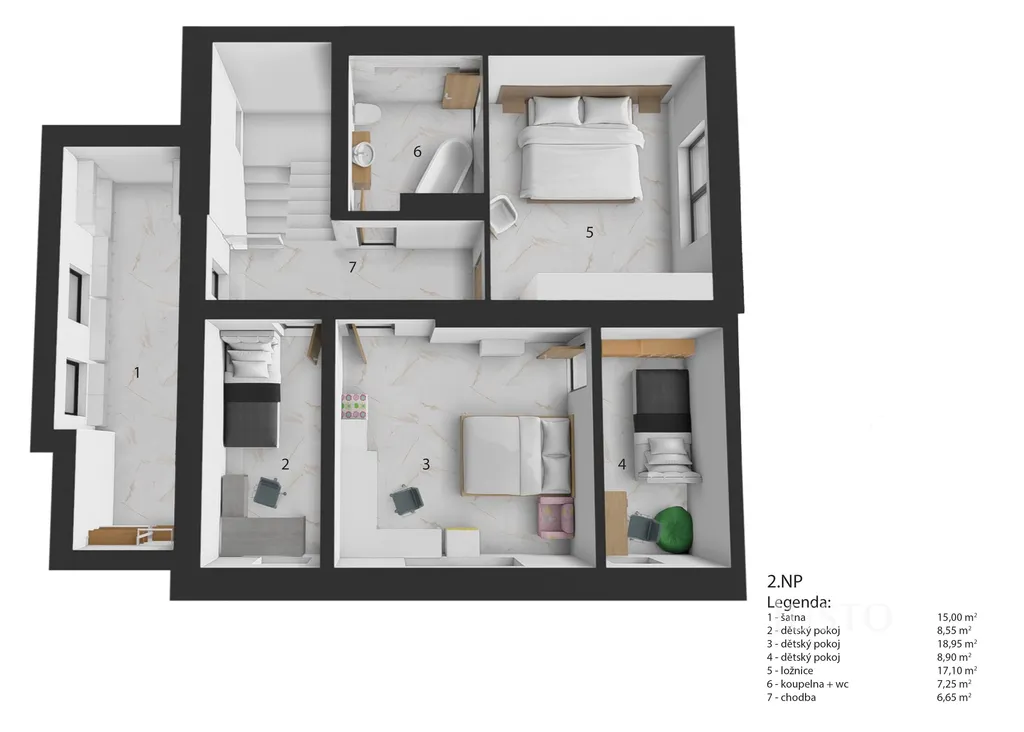 - zateplený obytný půdní prostor: ca 49 m²