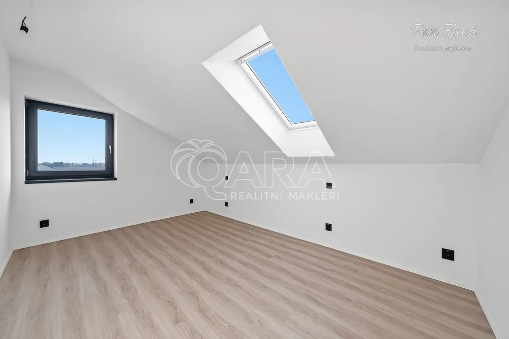 V patře na vás čeká klidová zóna, která nabídne ložnici, dva samostatné pokoje, šatnu a druhou koupelnu. Každý člen rodiny zde najde dostatek soukromí, pohodlí i vlastního prostoru.
