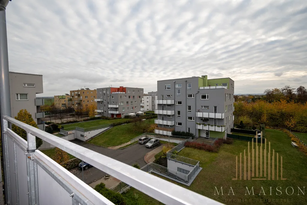 Byt se nachází v 4. patře budovy s výtahem a sestává ze: vstupní předsíně s vestavěnou šatní skříní, komory s pračkou a policovým systémem, koupelny s vanou, WC a úložnými prostory, samostatné ložnice, vybavené manželskou postelí a šatními skříněmi včetně komody se šuplíky a pracovní desky a z obývacího pokoje s kuchyňským koutem, kde je k dispozici rozkládací pohovka, TV stěna včetně TV, jídelní stůl, lednice s mrazákem, myčka nádobí, trouba, varná deska, mikrovlnka a spousty úložných prostorů. K bytu náleží vlastní balkon 4 m² přístupný z obývacího pokoje. Obyvatelé bytu jistě ocení, obzvláště v letním období, síťky proti hmyzu v oknech a u balkonových dveří.