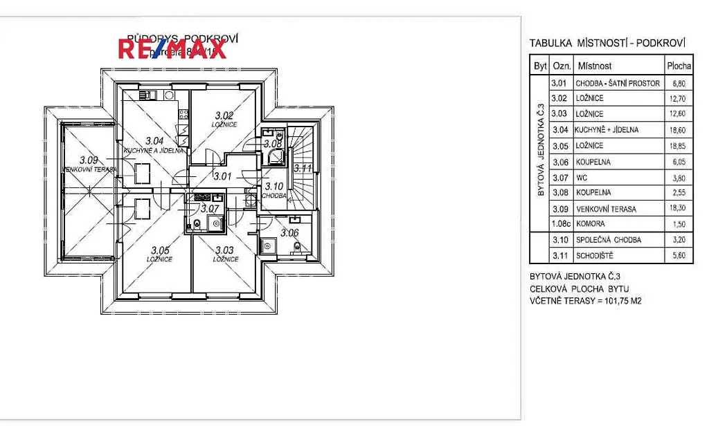 Dominantou tohoto bytu je prostorný obývací pokoj s kuchyňským koutem a linkou včetně spotřebičů. Z této místnosti je vstup na cca 18 m2 velkou zastřešenou terasu.
