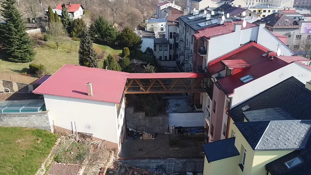 Dvorní objekt a propojení: Z mezonetového bytu v hlavní budově vede krytá propojovací lávka do samostatného objektu ve vnitrobloku. Tato stavba je zasazena do svažitého terénu a sestává ze čtyř podlaží: