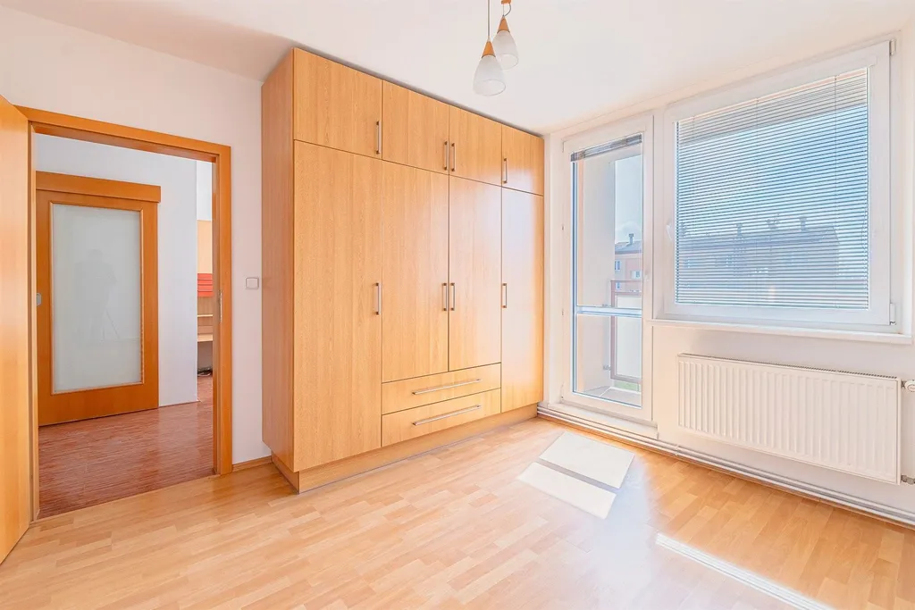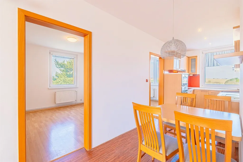 Dispozice: vstup se zádvěřím a vestavěnou skříní samostatné WC s umyvátkem obývací pokoj ložnice s velkou vestavěnou šatní skříní a výstupem na lodžii další pokoj (menší) čtvrtý pokoj průchozí kuchyně koupelna s vanou. Dále k bytu náleží komora v mezipatře, kde je i umístěný plynový kotel se zásobníkem.