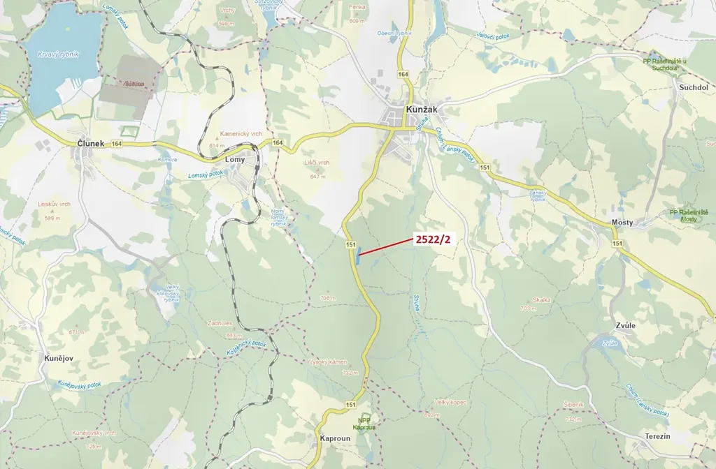 Lesní pozemek o výměře 8933 m2, parcelní číslo 2522/2, podíl 1/1, katastrální území Kunžak, obec Kunžak, obec s rozšířenou působností Jindřichův Hradec, okres Jindřichův Hradec, Jihočeský kraj. Po těžbě.