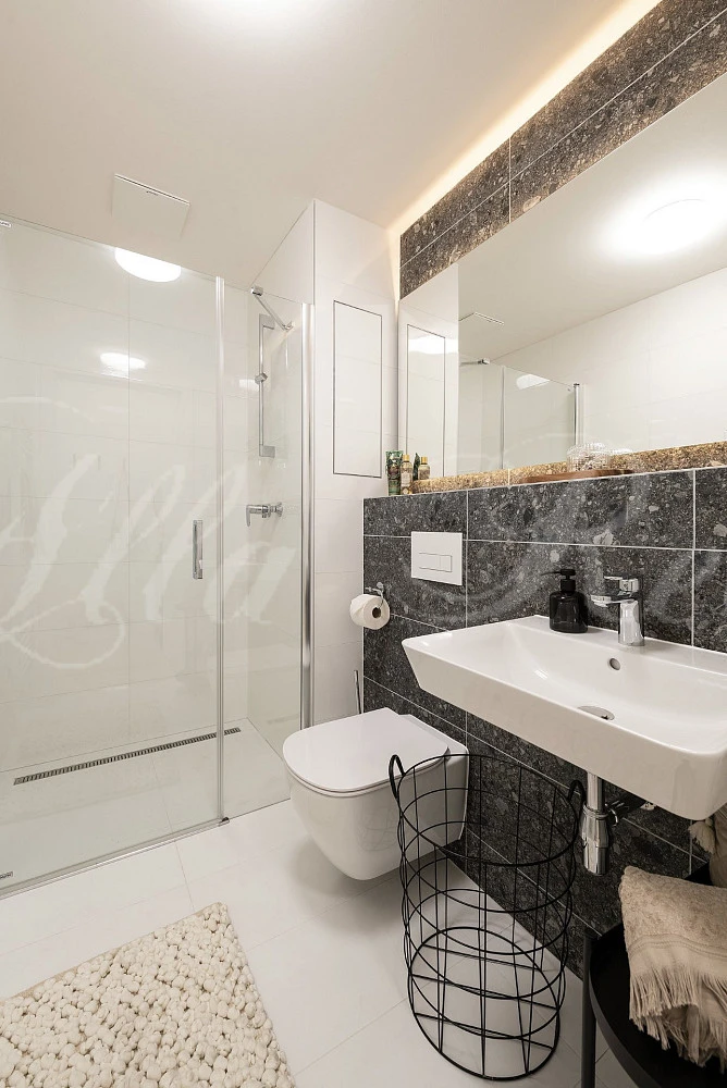 V koupelně bude stylová dlažba s velkým zrcadlem, WC a sprchový kout.