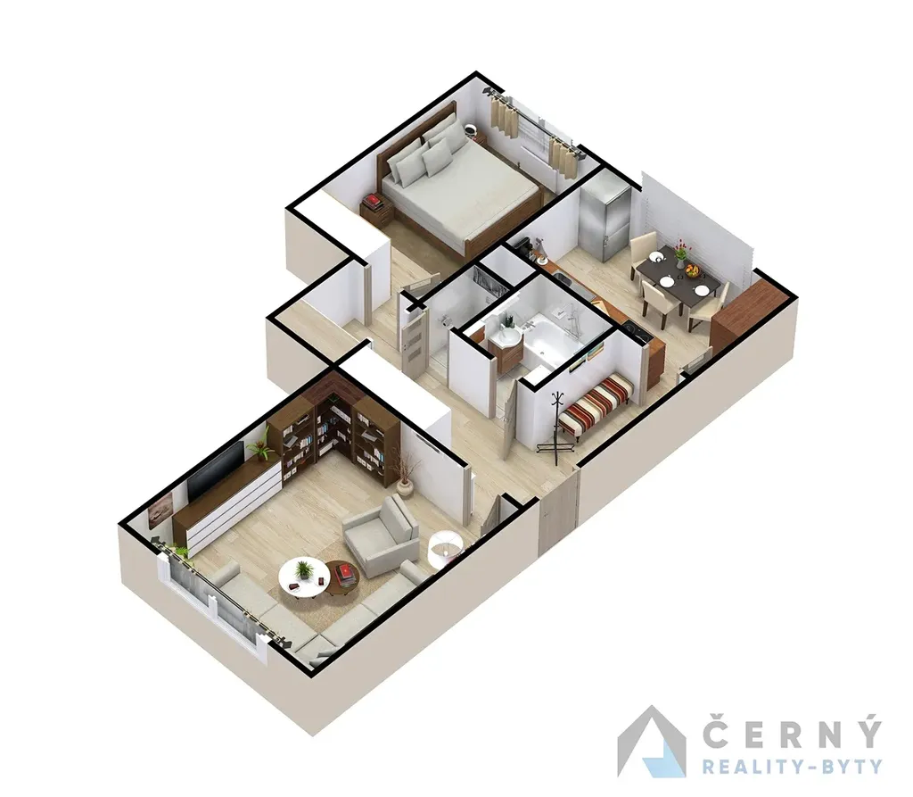 Dispozice bytu je řešena velmi funkčně - z prostorné vstupní předsíně, která je rozdělena do dvou částí, vedou vstupy do dvou neprůchozích pokojů, samostatné kuchyně, do koupelny a na toaletu. Byt má zděné jádro, koupelna a WC jsou oddělené. Okna bytu jsou plastová, opatřená žaluziemi. V předsíni jsou k dispozici dvě vestavné skříně, v kuchyni skříň spižní.