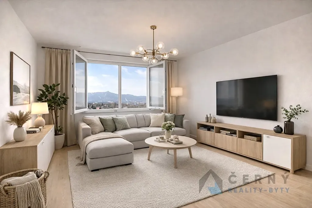 Z jedné strany bytu se otevírá panoramatický výhled na celé Ještědské pohoří, z druhé strany pak směrem na Jizerské hory, což vytváří jedinečný pocit prostoru a propojení s přírodou přímo z domova.